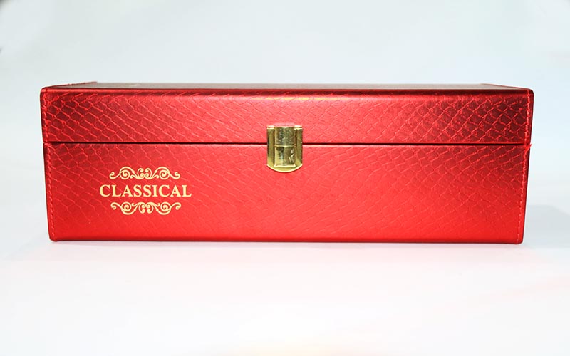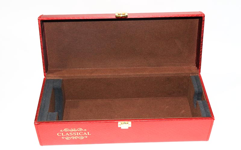 1.紅酒包裝盒面紙:採用進口紅色鳄魚皮紋路特種紙表面文字LOGO燙金擊凸,内包材裱光滑1800G雙灰闆 , 盒型爲上下翻蓋盒,下蓋和上蓋一樣的材質,整個盒子都是手工細作,盒子内部裱105G的中橘色絨布特種紙,黑字内部裝加厚彈力好的EVA。盒子部件整體做好裝上鍍金自動鎖。整個盒子基本成型